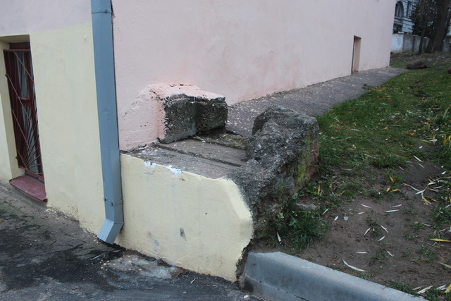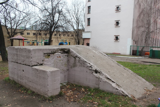 Еще один ДОТ, а точнее часть одной из его амбразур, торчит из угла жилого дома, стоящего за Дворцом Профсоюзов. Судя по расположению объекта, его огонь был направлен на мост через р. Свислочь.