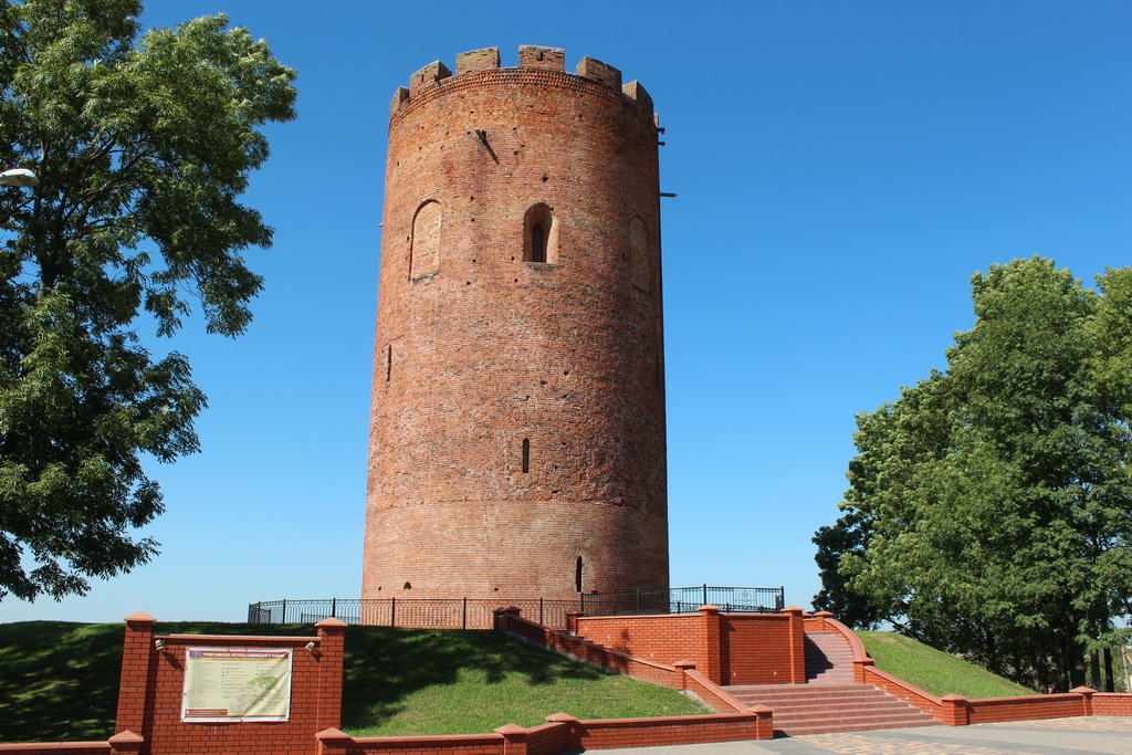 Высота пятиярусной башни 30 м, стены толщиной 2,5 м, внешний диаметр - 13,6 м. В основе укрепления - мощный фундамент из камня. Сама постройка сделана из брускового кирпича темно-красных и желтоватых оттенков в технике "балтийской" кладки. В стенах башни есть бойницы, между ними на внешней поверхности размещены четыре плоские ниши с верхом полуциркульного вида. Сверху пятого яруса находятся остатки свода из кирпича. Этот свод имеет утолщенные ребра, которые имеют снизу небольшие кронштейны с узким пояском.