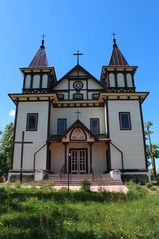У прямоугольного в плане основного объема имеется пятигранная апсида. Из-за основного объема симметрично выступают примыкающие к апсиде две низкие сакристии. На главном фасаде две башни, завешенные глухими четвериками с высокими пирамидальными шатрами. Между башнями – фронтон с люнетом. Главный вход оформлен при помощи декоративного крыльца с двускатным навесом на двух колоннах. Стена горизонтально обшиты досками. Фронтон, четверики, карнизы и окна декорированы накладными деталями геометрической формы. Боковые стены прорезаны высокими стрельчатыми окнами и укреплены ступенчатыми контрфорсами. К главному входу ведет низкая лестница.