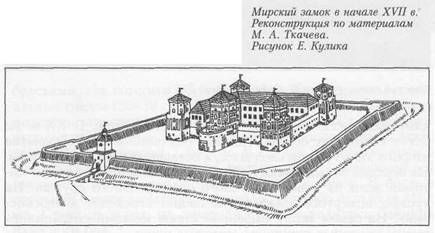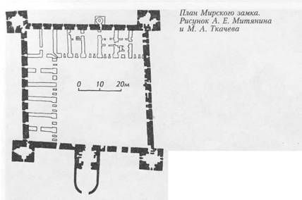 Каменный замок в Мире (Гродненская область) стоит на правом берегу реки Мирянки. Возведен в 1506-10 гг. Его планировка представляет собой немного перекошенный четырехугольник, на углах которого стоят выступающие за границы стен башни. Они все имеют одинаковую форму: четырехгранная основа и далее сужающийся верх в виде восьмигранника.