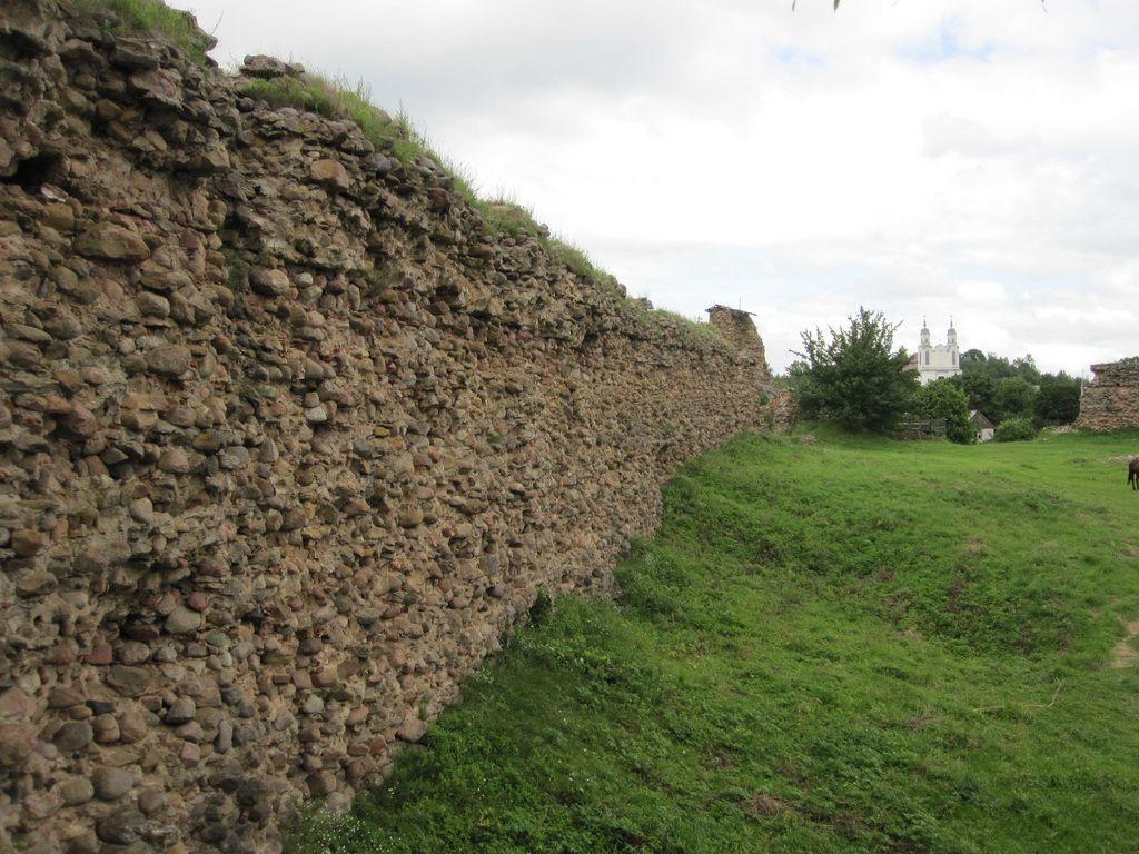 Форма неправильной трапеции была выбрана сообразно направлению нападения. Чаще всего осада угрожала северной стене. Ее длина достигает 85 м (не учитывая стену Княжеской башни), восточная, самая длинная - 108,6 м, южная - 71,4 м и западная - 97,3 м. Толщина замковых стен доходит до 2,8 м. Фундамент толщиной 2 метра выполнен из камней среднего размера, имеет цоколь в 30 сантиметров, и лежит на «подушке» из жердей и веток (использовались дуб и ель). Камень в замковых стенах использовался до высоты 4 м. Далее (только внешняя сторона) идет кирпичная кладка толщиной 65-70 см. До разрушения замок имел стены высотой 12-13 м. По всей их длине, на высоте 10 м, проходила боевая галерея из дерева. Стрельба защитниками замка велась через бойницы, проложенные с промежутком в 2,4 м.