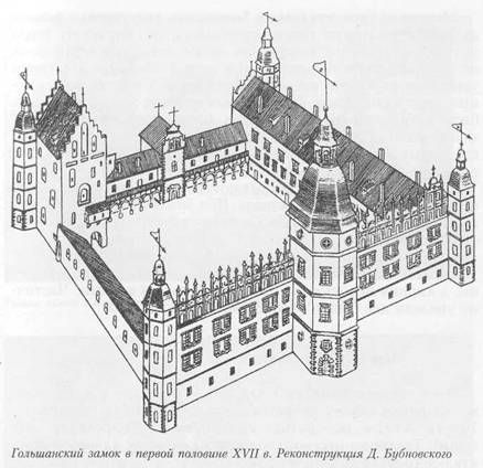 Каменный замок в Гольшанах построили в первой половине XVII в. По своей композиции он немного похож на замок в Мире и имеет форму прямоугольника со сторонами 88,5 м и 95,5 м. Жилые части с башнями по углам образовывают внутри, как и в Мирском, замкнутый двор. Воротная башня не строилась, а угловые имеют форму шестигранников. Они в основном использовались под жилье и для хозяйственных помещений. Главенствующая роль в обороне замка отводилась мощным земляным валам и рвам, заполненным водой. Въезд в замок располагался в центре одного из корпусов. Напротив этого въезда в противоположной стороне двора в жилое здание была встроена небольшая каплица.