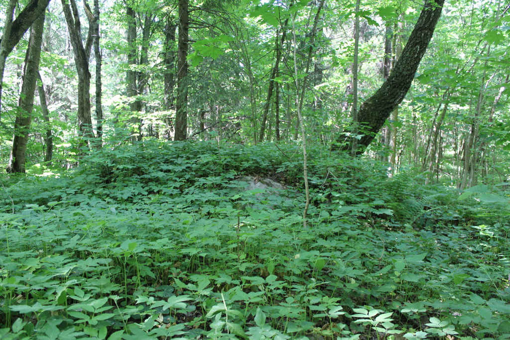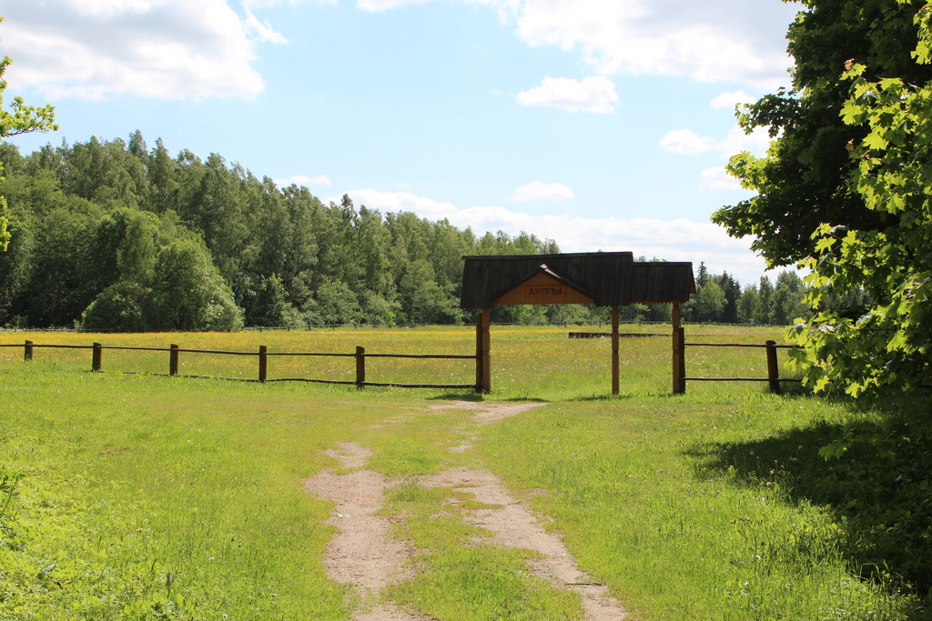После музея идем далее деревенской улицей. Около дома №19 находится памятник мирным жителям, которые были расстреляны фашистами в 1943 г. От этого места выходим за дома на луг, поднимаемся вверх и, зайдя в лес, на самой вершине возвышенности можно найти еще один курганный могильник – 65 насыпей высотой от 40 см до 2 м.