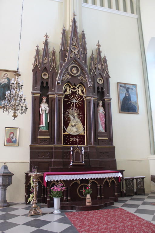Интерьер храма не поражает богатством, но отличается очень хорошо выдержанным стилем. Эстетическую завершенность Троицкому костелу придает дивный ландшафт вокруг с редкими декоративными растениями и фигурами апостолов, что вызывает интерес к храму у тех туристов, кто предпочитает Туризм и отдых в Беларуси.