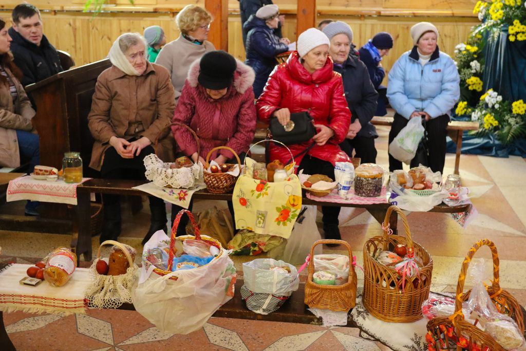 Следующие несколько дней до Пасхи в основном посвящались окончательным приготовлениям. В частности, в пятницу выпекался черный хлеб, а в субботу прочая выпечка (куличи, пасха), красились яйца. Все для того, чтобы часть из этих вкусностей понести для освящения на службу (с субботы на воскресенье). Всенощная считалась праздничным и торжественным событием, поэтому на службу все старались одеться красиво; надевали все лучшее и нарядное. К слову, для освящения многие несли все то, что потом будет присутствовать на столе. Поэтому нередко батюшка освящал колбасу, творог, овощи, соленья и прочие продукты и даже блюда. На застолье первым блюдом надлежало попробовать кусочек освященного яйца. Затем приступали к игре под названием «битки» - соревновались: чье яйцо крепче. Некоторые катают яйца и выбирают самое проворное.