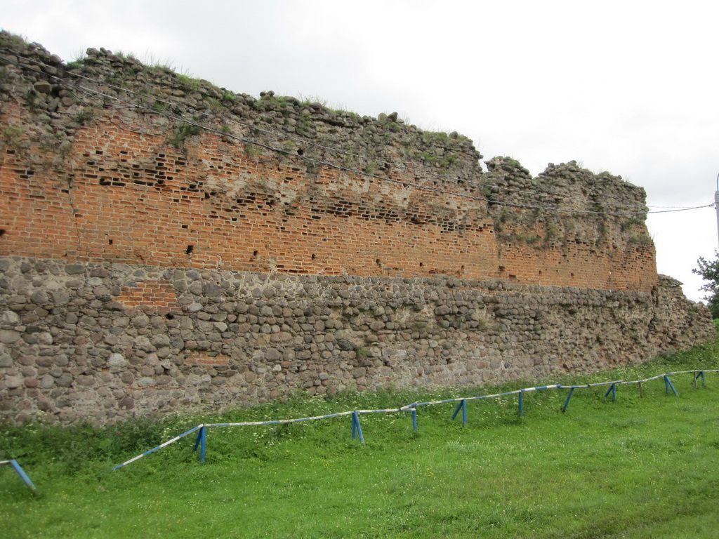 Форма неправильной трапеции была выбрана сообразно направлению нападения. Чаще всего осада угрожала северной стене. Ее длина достигает 85 м (не учитывая стену Княжеской башни), восточная, самая длинная - 108,6 м, южная - 71,4 м и западная - 97,3 м. Толщина замковых стен доходит до 2,8 м. Фундамент толщиной 2 метра выполнен из камней среднего размера, имеет цоколь в 30 сантиметров, и лежит на «подушке» из жердей и веток (использовались дуб и ель). Камень в замковых стенах использовался до высоты 4 м. Далее (только внешняя сторона) идет кирпичная кладка толщиной 65-70 см. До разрушения замок имел стены высотой 12-13 м. По всей их длине, на высоте 10 м, проходила боевая галерея из дерева. Стрельба защитниками замка велась через бойницы, проложенные с промежутком в 2,4 м.